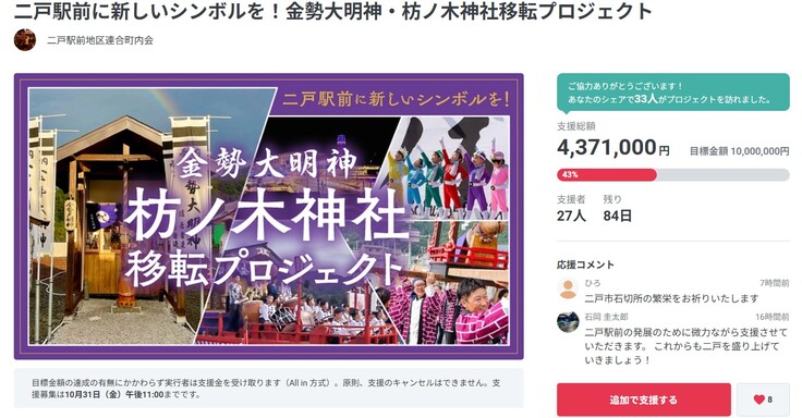 盛り上がってまいりました!枋ノ木神社移転プロジェクトクラファン!