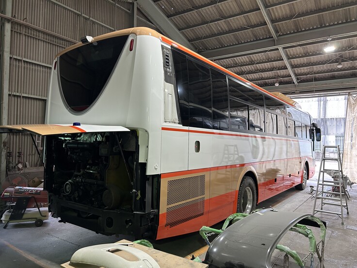 車体のベースとなるオレンジと白の塗装は概ね完了しており、後は車体前面のエンブレム(旧社章)や側面の「SHINKI BUS」のロゴなどを貼り付けていく段階となっております。