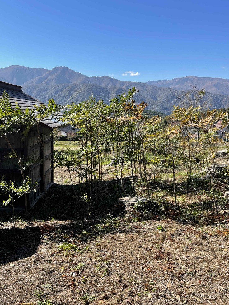 神社裏手の山に自生しているタラの芽の木(後方に見えるのは、南アルプス)