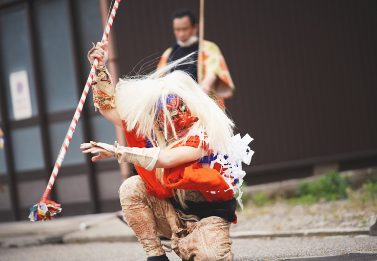 松明を手に獅子と踊り舞う天狗、悪魔や邪気を祓い場を清める霊獣獅子、愛らしい表情の子どもの獅子あやしキリコ、少し離れて見守るように笛や太鼓を演奏する囃子方…その登場人物達は、それぞれ役割を担っていてどこが欠けても「新湊獅子舞」は完成しない。