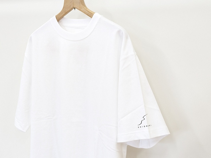 オーバーサイズTシャツ。袖にワンポイントで「SHIOGORI」のロゴ入り。