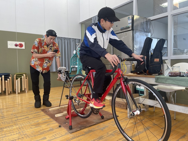 *自転車でコーヒー豆を弾く仕掛けを開発中のアーティストの冨田哲司さん