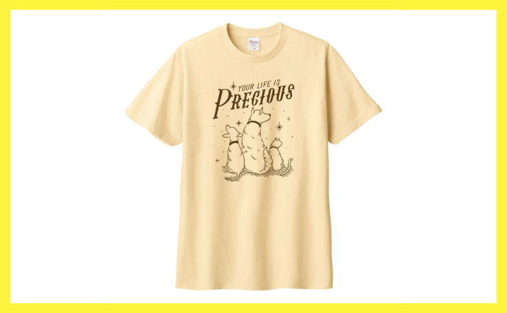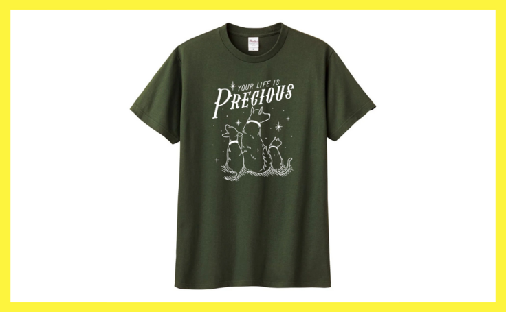 2017年にチャリティー専門ファッションブランドJAMMINさまとコラボし期間限定で販売したチャリティーTシャツを今回のクラウドファンディングで復刻しました。 “Your life is precious”、「あなたの命は、尊い」すべての犬猫たちへの思いを込めたデザインとなっています。