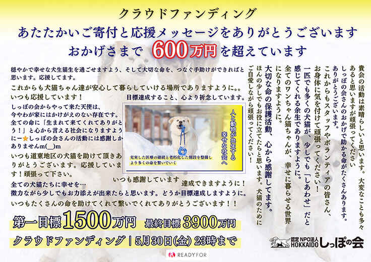 HOKKAIDOしっぽの会のクラウドファンディングを応援いただき、ありがとうございます。