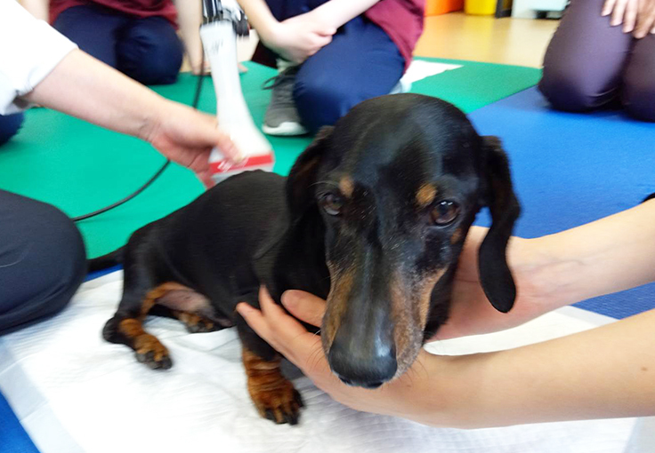 その後、飼い主さんの都合もあり当会で引取りし、定期的に大学病院に通いマッサージや歩行のリハビリを受け、夜はスタッフが自宅に連れて帰り、根気強くリハビリを行ってきました。