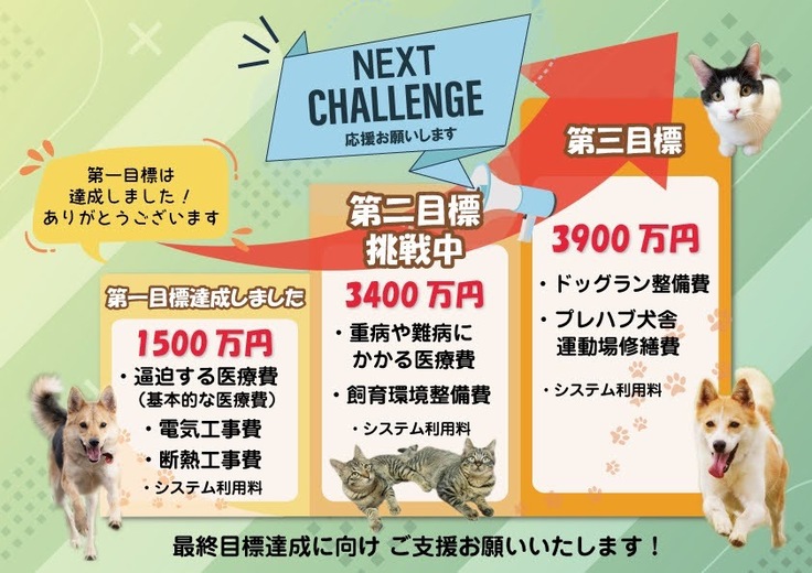 当初からページに記載していた通り、重症や難病にかかる治療費や継続的な医療費、そして飼育環境整備費として旧犬舎の大規模な床工事費・猫舎の修繕費に充てさせていただきます。