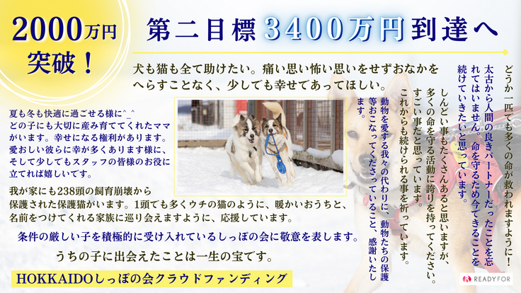 皆さまのおかげで、2000万円突破!目標の3400万円へラストスパート