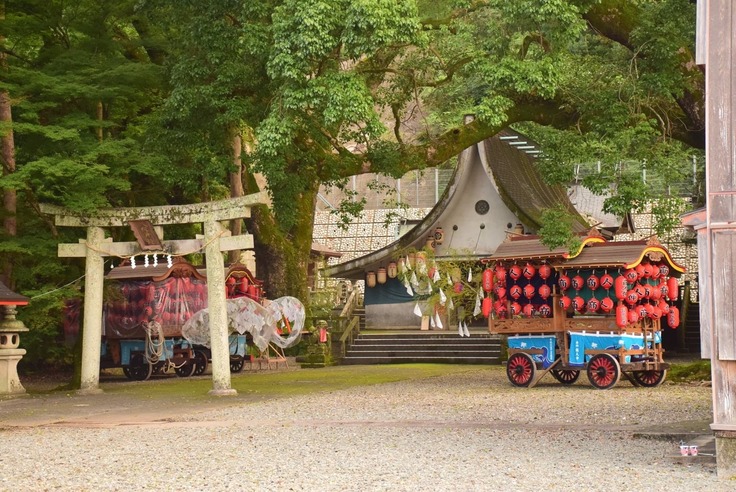 宍喰の八坂神社は、地元の人達から「祇園さん」という愛称で呼ばれています。 夏の祇園祭では、四台のダンジリと呼ばれる勇壮な山車や、美しく飾られた関船が町内の祗園通りを練り歩く華麗な姿が見物でき、 花火大会や夜店もあり多くの人で賑わいます。