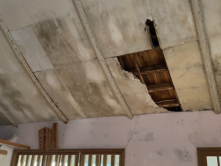 しかし、この地域は台風が多い地域のため、長年の風化により瓦が剥がれ落ち、床板や天井は朽ちています。安全性を考慮すると、一刻も早い修繕が必要となっていますが資金と人手が足りていない状況です。