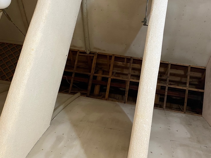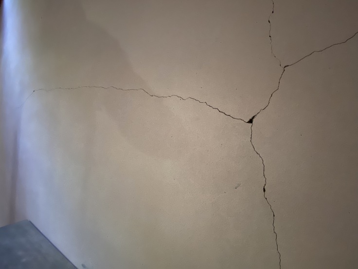 さらに外部の側面のひび割れも酷く、内部は雨漏りのせいで天井が剥げ落ちています。