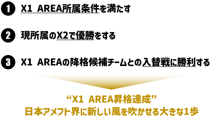 2023年、ゴリラズは上位リーグである「X1 AREA昇格」に挑戦します。 目標とするX1 AREA昇格を実現するためには、以下3つの条件を満たす必要があります。