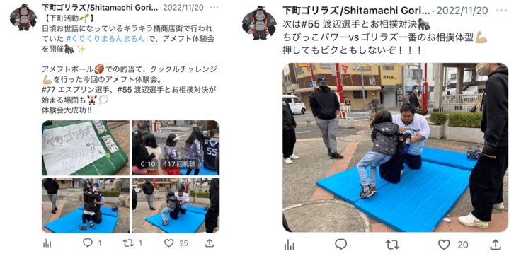 ゴリラズでは、地域密着型の活動として、チーム名にもなっている東京都の”下町地域”を中心に地域貢献活動に取り組んできました。東京都墨田区にあるキラキラ商店街では、”毎月の清掃活動”や”イベント支援”、”子どもたち向けのアメフト体験教室”などを開催しています。