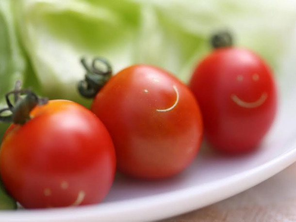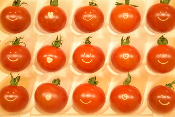 写真のようにミニトマトに笑顔マークやハートマークが描かれているのです!