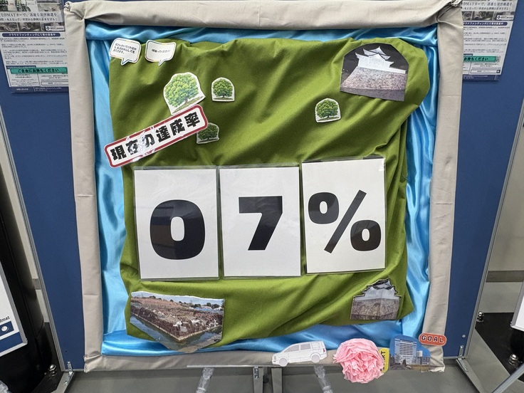 ※この中央の立て看板は、駿府城公園の内堀を模しています。達成率が上がると、右下にある当院からDMATカーが出発。内堀1周を目指します。