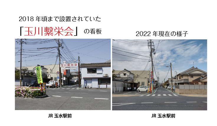 According to "Ide Town's" Rumor " published by the Youth Department of the Ide Town Chamber of Commerce, In the latter half of the Meiji era(1860’s~1910’s), when our lumber industry was active, the section between Kyoto and Nara (currently the JR Nara Line) opened. It seems that the area in front of Tamamizu Station has developed as the only shopping district in the southern Kyoto area, which is lined with shopping districts. During the Taisho-Showa period(1920’s~1960’s), when our construction business was active, there were bars, cafes, and billiard halls. At that time, there were many entertainment facilities such as movie theaters, candy stores, pharmacies, and barbershops around the station. By the way, in the olden days, it was much busier than the neighboring Kyotanabe city as a post town. The impression of Ide town was that there was a lot of nature but few shops. Nowadays, I was able to find out about the existence of old-fashioned "shops" that are still open even when the private shops around them are closing, but the shop owners are aging, and we don't know how long they will continue. There was a sign called "Tamakawa Prosperity Association" in front of the station, but it has been removed now, and only banks and post offices stop by. I would like to somehow regain the "notification" that should be in front of such a station.