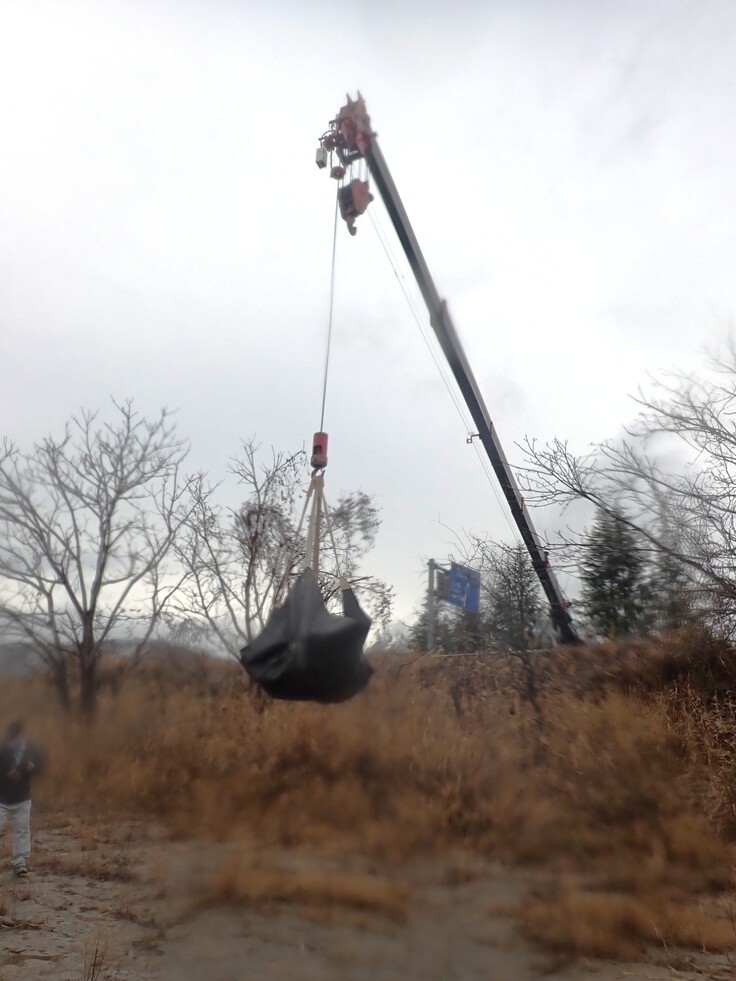 あっちゃんくじらの続きです。貴重な全身骨格であることがわかったので、石ごとエンジンカッターで切って、大きなブロックで持って帰ることにしました。しかし!重い。当たり前ですが、大きな石の塊なので、重いのなんの。最初、そりにのせてみんなで引っ張ったのですが、なかなか進まない。そこで、クレーンの登場です。クレーンだとあっという間。無事にあっちゃんクジラをもって帰ることができました。