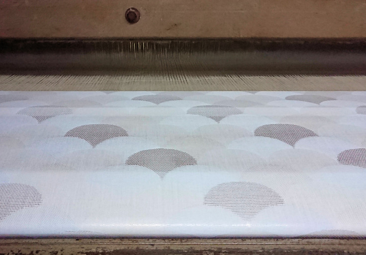 文字通り糸を絡める様にして独特の立体感と透け感を表現する『カラミ織』を複雑なジャカード織の模様の中に組み込み、美しい布を織る技術です。