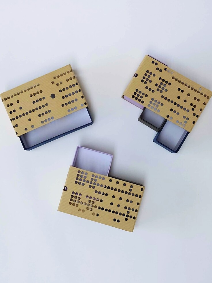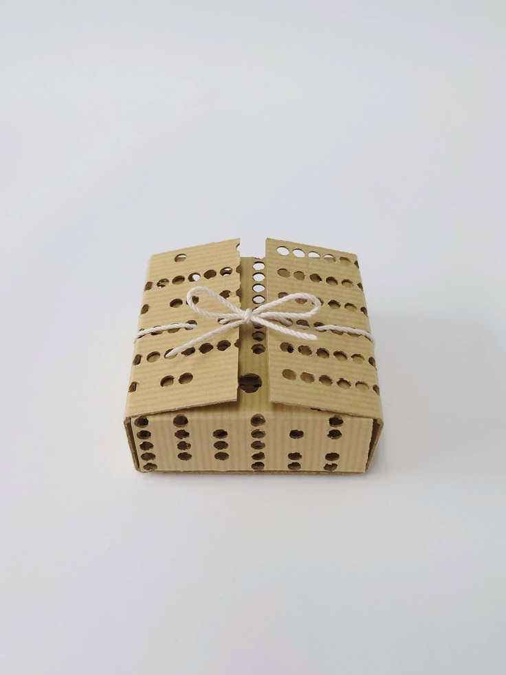 箱やワークショップの材料として使用している『紋紙(もんがみ)』は、古いジャカード機で柄を描く為に使われるパンチカードです。イメージとしてはアナログなデータカードと言ったところでしょうか。