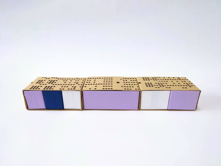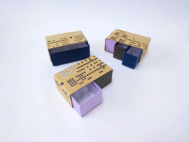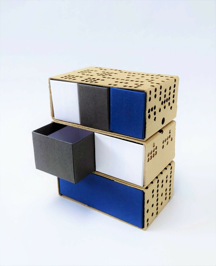 これは、古いジャカード織機で柄を描くために使用するパンチカード『紋紙(もんがみ)』を使って製作された引き出しタイプの箱です。