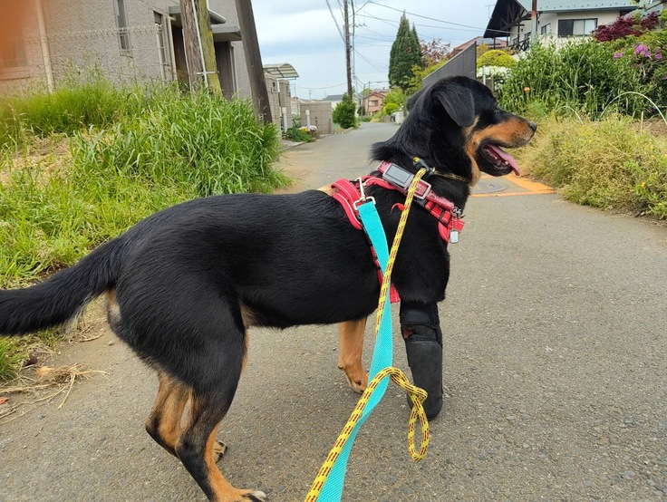 以前、3本足で散歩している時はペースもゆっくり、距離も他の犬より短めにしていましたが、義足を付けてからはペースも距離も他の犬と変わらないくらい歩けるようになりました。