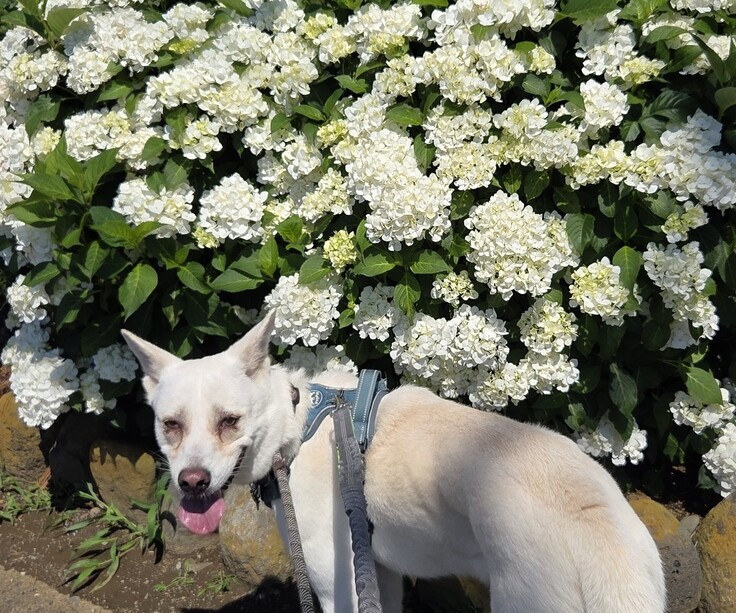 かなりのおばあちゃんなので、日陰を選んで短い距離をゆっくりゆっくり歩きます。ほとんど視力はないけれど、お散歩が好きで、またうまく歩いていて楽しそう。においや草や風の感触などがよくわかっているようです。こうした刺激を大切にしないと、つい眠る時間が長くなってしまいがちです。