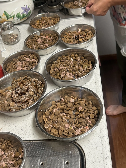 ドライフードを与える時は、数種類をミックスし計量して缶詰などのウェットフードを混ぜ込みます。災害時などでフードが手に入らない時に、特定のものしか食べられない状態を防ぐためです。