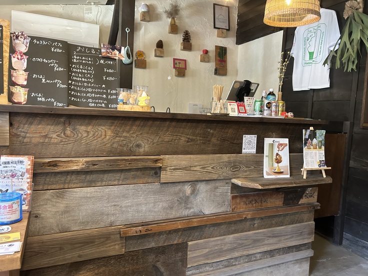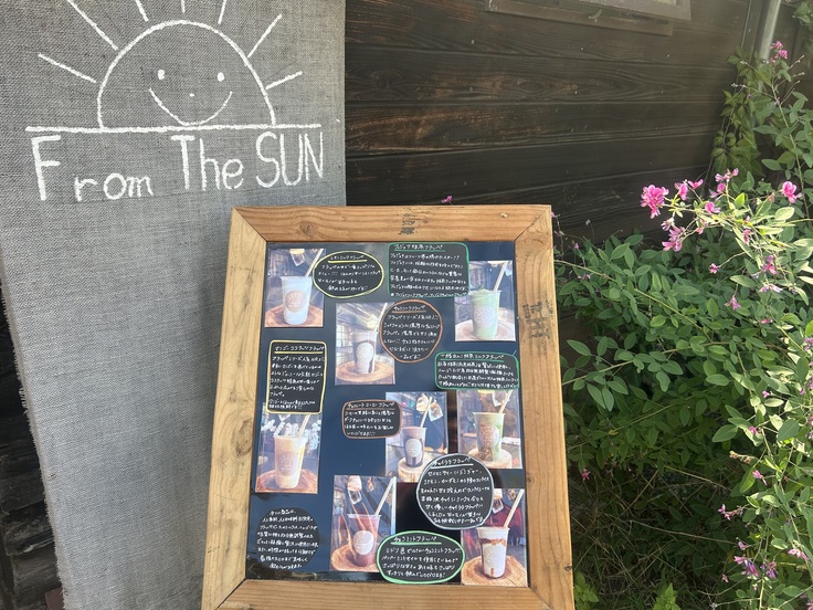 萩の花が揺れる古民家的な建物。シェイクなどのスイーツ的なカップの写真が並んでいます。