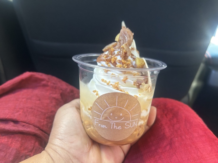 ソフトクリームにはマロンペーストと砕いた栗がたくさん。下の方はポン菓子的なお米のパフで、食べ応えはしっかりです。
