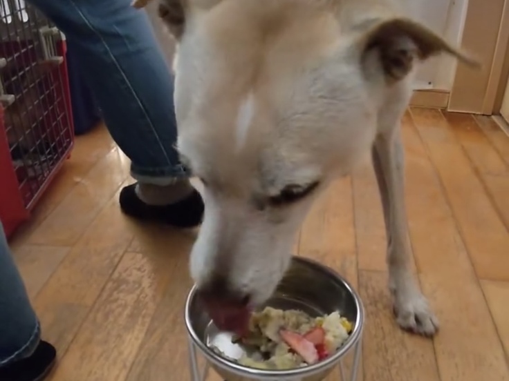 これは衰弱した状態でレーベン入りし、口にシリンジで液状栄養を流し込んでいたパユが、自分からふやかしご飯に口を突っ込み食べ始めた時の記念。祝い膳ではありませんが、食べることは生きること。適度な量でわくわくしながら食を楽しんで欲しいと愛情をたっぷり振りかけ、一時的なお母さんであるボラ達は犬の空っぽお皿を引き上げる時に、いつも喜びを感じているのです。