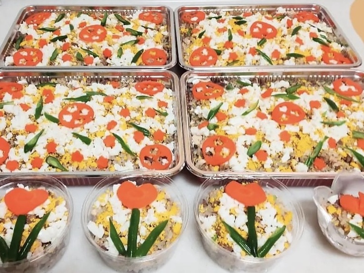 これはレバー炊き込みご飯に錦糸卵や野菜で飾りつけた、ひな祭りのちらし寿司。香りも高くて、もう保存容器に飛び込みたい!(できた途端に食べ切るので、保存もしませんが)