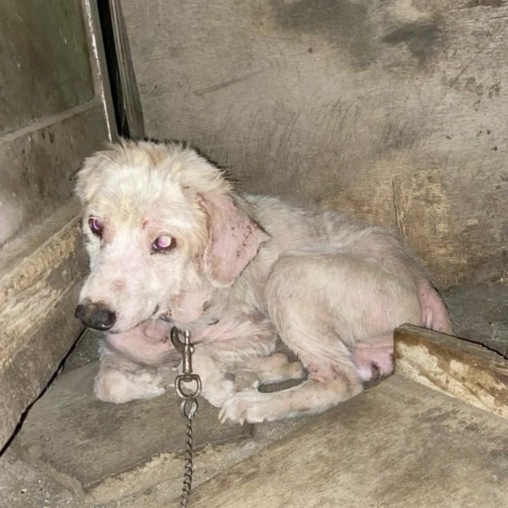 繋がれたまま、ノミダニなどから身を守る方法がなく。ただれた皮膚を治すのには、時間がかかります。(これはかなり回復してからの様子)