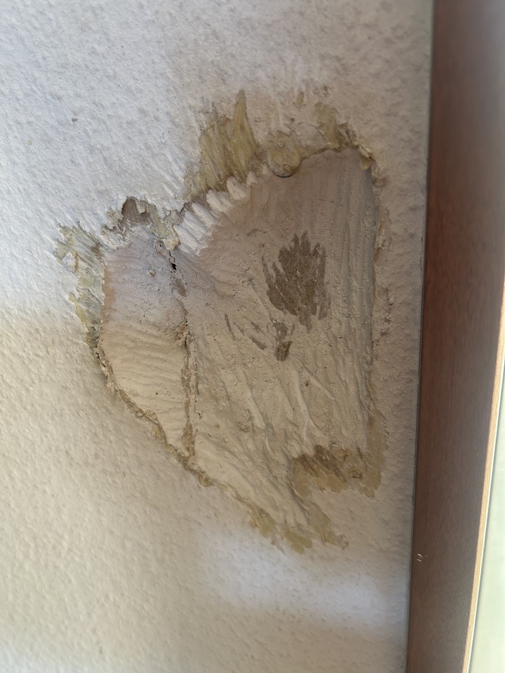 寄せたカーテンの陰に、今日も見つけてしまいました。下地は防水性がないので、すぐ対応する必要があります。
