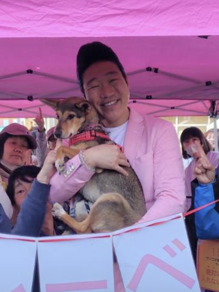 タレントのみやぞんさんは、ピンクのスーツ。保護犬のメイちゃんとご一緒です。