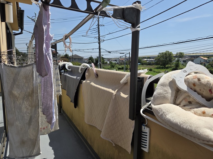 天気が良ければこんな感じでベランダいっぱいに干しています。干し終わると何だか達成感。