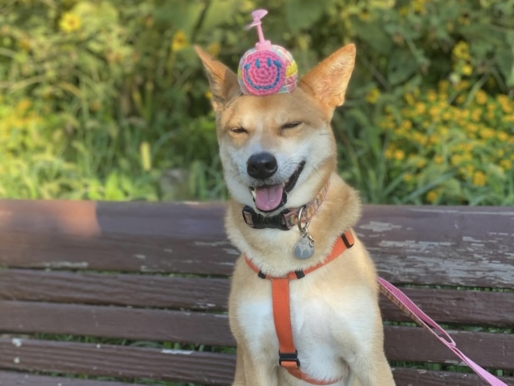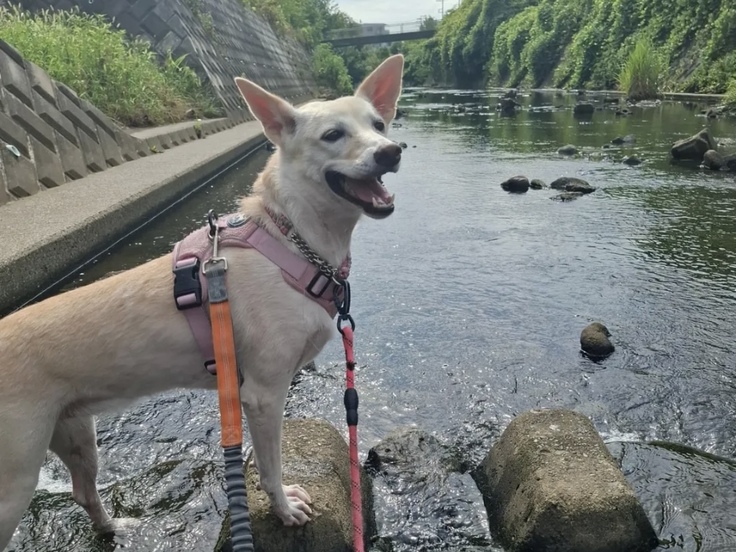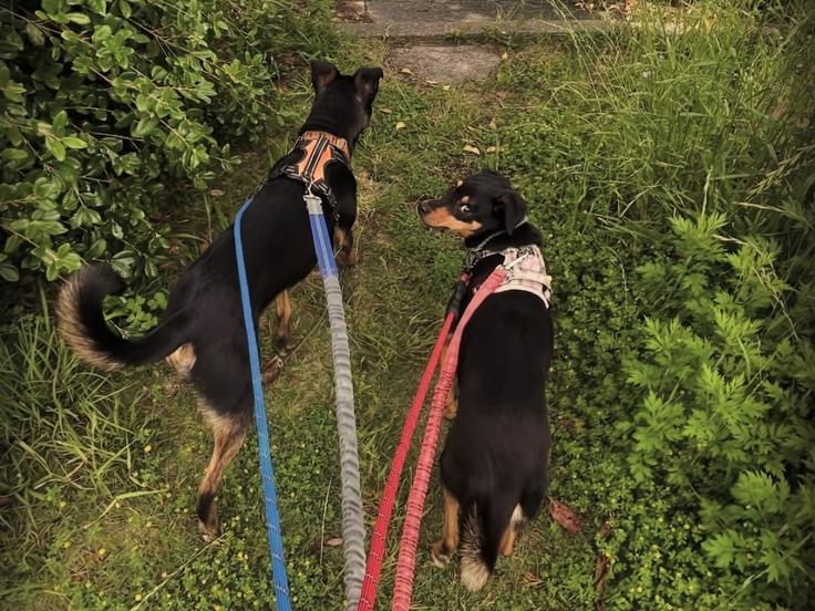 2本のリードが外れてハーネスだけになったパンナは、ルンルンで先頭を歩き出しました(ビビりですが、陽気な性格なのです)。わたしは一瞬思考停止、名前を呼び追いかける、いちばんやってはいけない衝動に駆られましたが、グッと我慢。