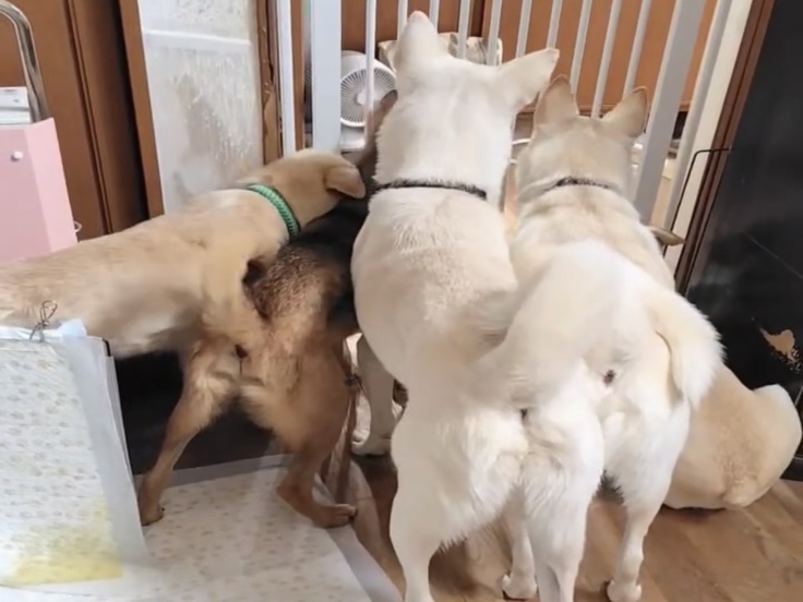これは先日、見かけない業者の方が部屋に大きな部材を持って入り、少し音が出ながら窓枠を変えている時の様子。代表が室内にいることもあり、威嚇ではなくてびっくりしていることもあり、犬達はじーっと様子を凝視して騒がなかったのは立派でした。不安そうな犬にはボディタッチで落ち着かせ。人間も犬と助け合って心を落ち着かせているかのよう。
