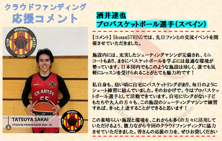 B3リーグの湘南ユナイテッドBCで活躍していた酒井達也選手から応援コメントを頂きました。