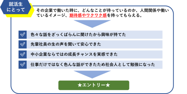 このように、双方にとってメリットが生まれ、良いスパイラルの入り口を開く役割になります。また距離感の近いコミュニケーションを図ることで、より具体的に情報交換ができる為、入社後の離職率低減にも良い影響を与えることができます。