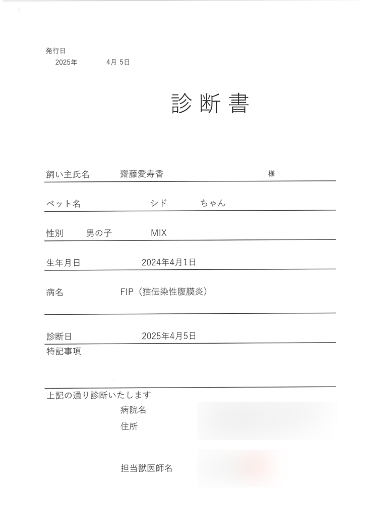 掲載している診断書は、動物病院から掲載許諾を得ております。