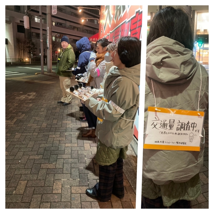 昭和会館北交差点での交通量調査の様子です。 この日は、東京新聞様に取材をしていただきました。
