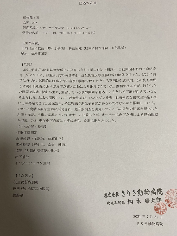 ●7/27急激な体重減少(425g)し、ご飯を食べなくなり、尿が白濁、動かなくなりました。