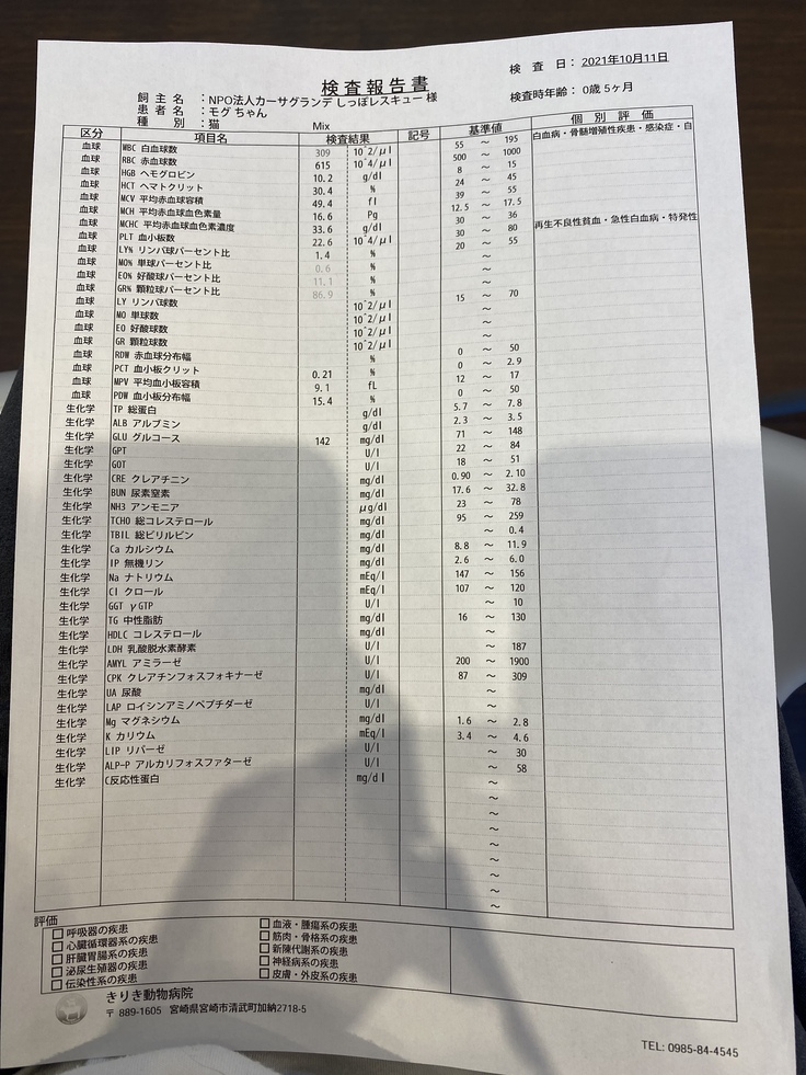 現在(10/15)、420g、眼振、震え、痙攣、食欲不振、排尿垂れ流しで