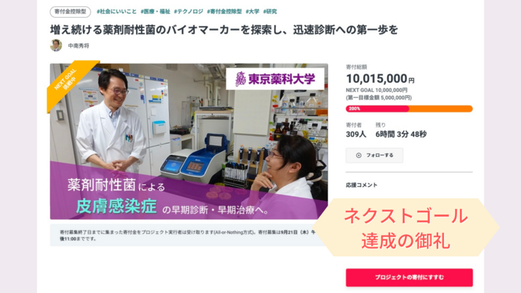 本日23時までのクラウドファンディング期間に、引き続きご寄付をいただくことができました金額については、開発する迅速診断装置を海外で普及させるために欠かせない国際特許の出願費用に充てたいと考えております。