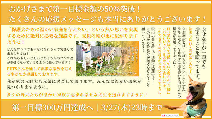 1月27日から開始した『譲渡しにくい野犬の子もあたたかい家族に迎えられる未来を目指して』プロジェクトですが、目標金額300万円の50%を達成することができました!