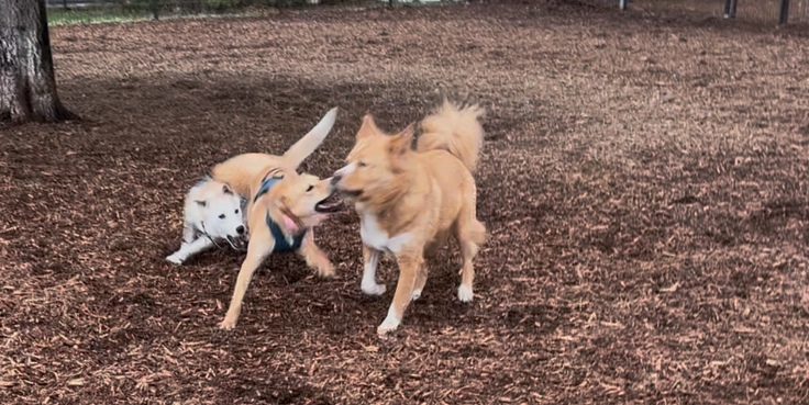 最初は先住犬とくるに距離がありましたが、いつものメンバーであるうちの犬との遊び方を見てるうちに学んだようで参戦してくれました。