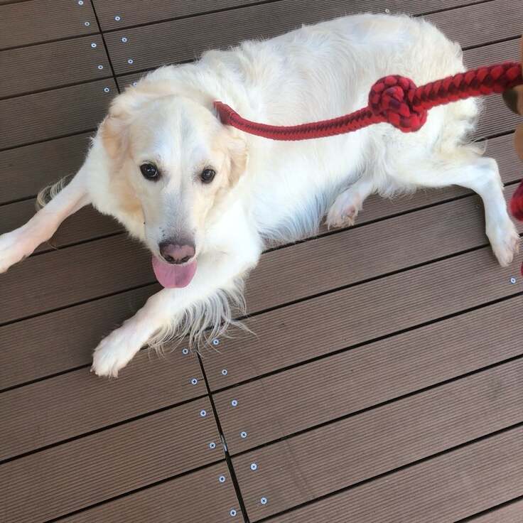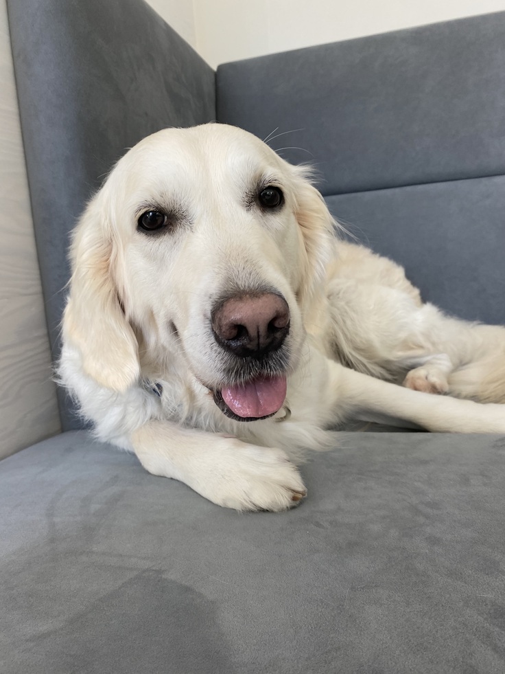 最初はこの犬種を知らず、ゴールデンは茶色いと思っていたので、「雑種の白い大きい子」だと思っていました。