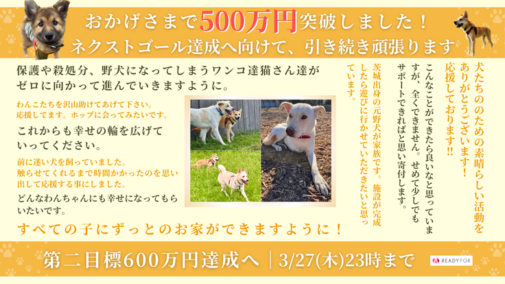 皆さまのあたたかいご支援のおかげで、 ついに500万円を達成しました!