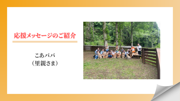 #3としてご紹介するのは、里親様からの応援メッセージです。里親さんの愛情が、保護犬たちに新たな希望を与えていることを実感しています。どうぞご覧ください。