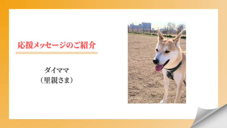 ダイちゃんへの深い愛情がひしひしと伝わってくる素敵な応援コメント、ありがとうございます。保護犬たちが新たな家族に出会い、幸せな日々を送る姿を見守ることができるのは、皆さまの愛と支えがあってこそです。これからも、どうぞ変わらぬご支援と温かい応援をよろしくお願い申し上げます。