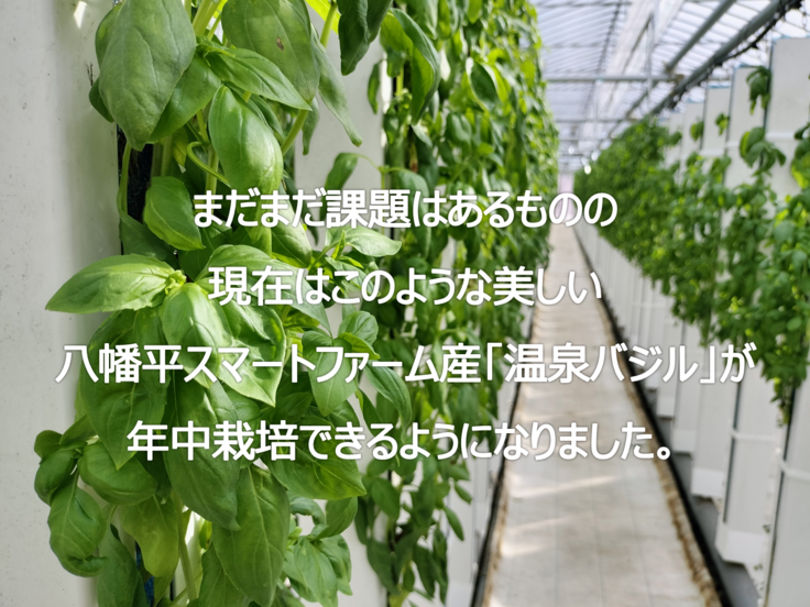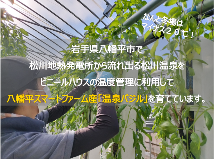 はじめまして。私たち八幡平スマートファームは、雪深い岩手県八幡平市で、日本で初めて商用稼働した松川地熱発電所から流れ出る松川温泉を活用し最先端のIoT技術を使うことで、CO2フリーで地球にやさしい【八幡平スマートファーム産】温泉バジルを通年栽培しております。